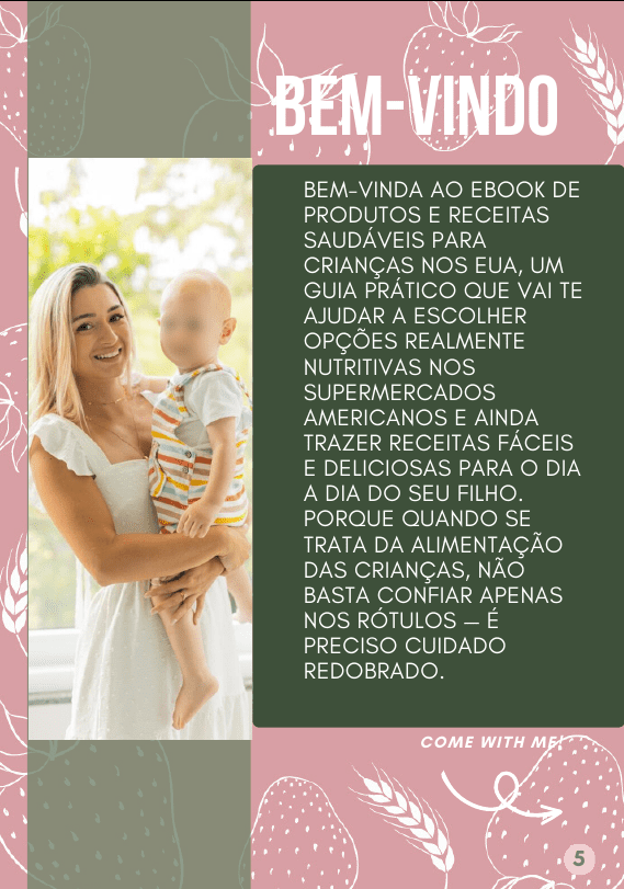 Neste Ebook você vai encontrar uma seção de produtos saudáveis que voce pode ofertar para seu filho nos Estados Unidos. Além de lanchinhos práticos para o dia a dia.